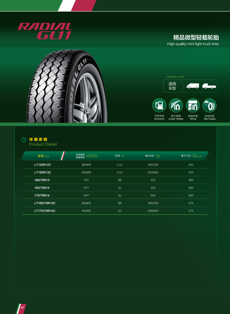 精品輕載輪胎,高強胎體結(jié)構(gòu),承載力更強,耐磨橡膠配方和加深花紋,更高的使用壽命。