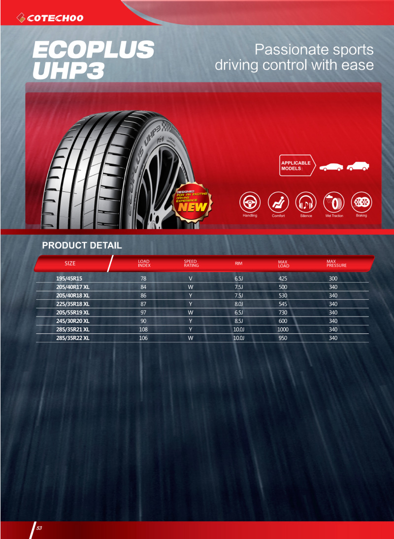 全新設(shè)計運(yùn)動型花紋,應(yīng)用高含量白炭黑配方,提供優(yōu)秀的抗?jié)窕阅埽炫冗\(yùn)動,駕控自如。