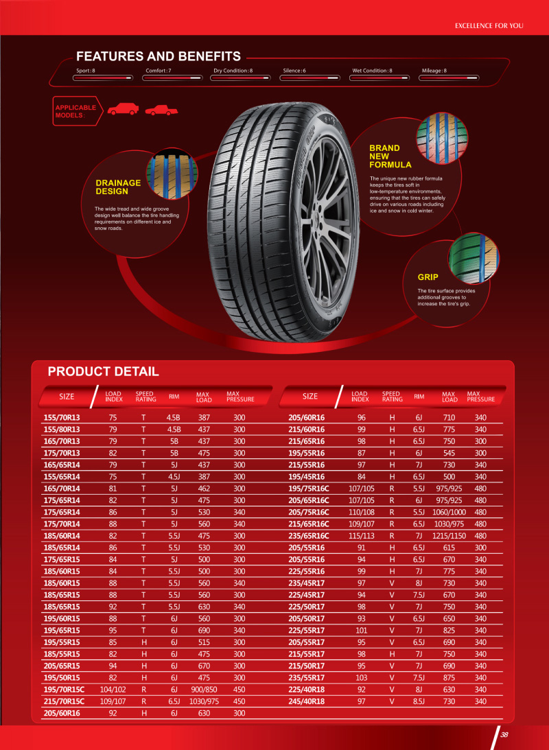 特有全新橡膠配方,馳騁寒冬,駕馭冰雪適合各種路面,很好平衡了輪胎在不同的冰雪路面上對抓地和操控的需求。